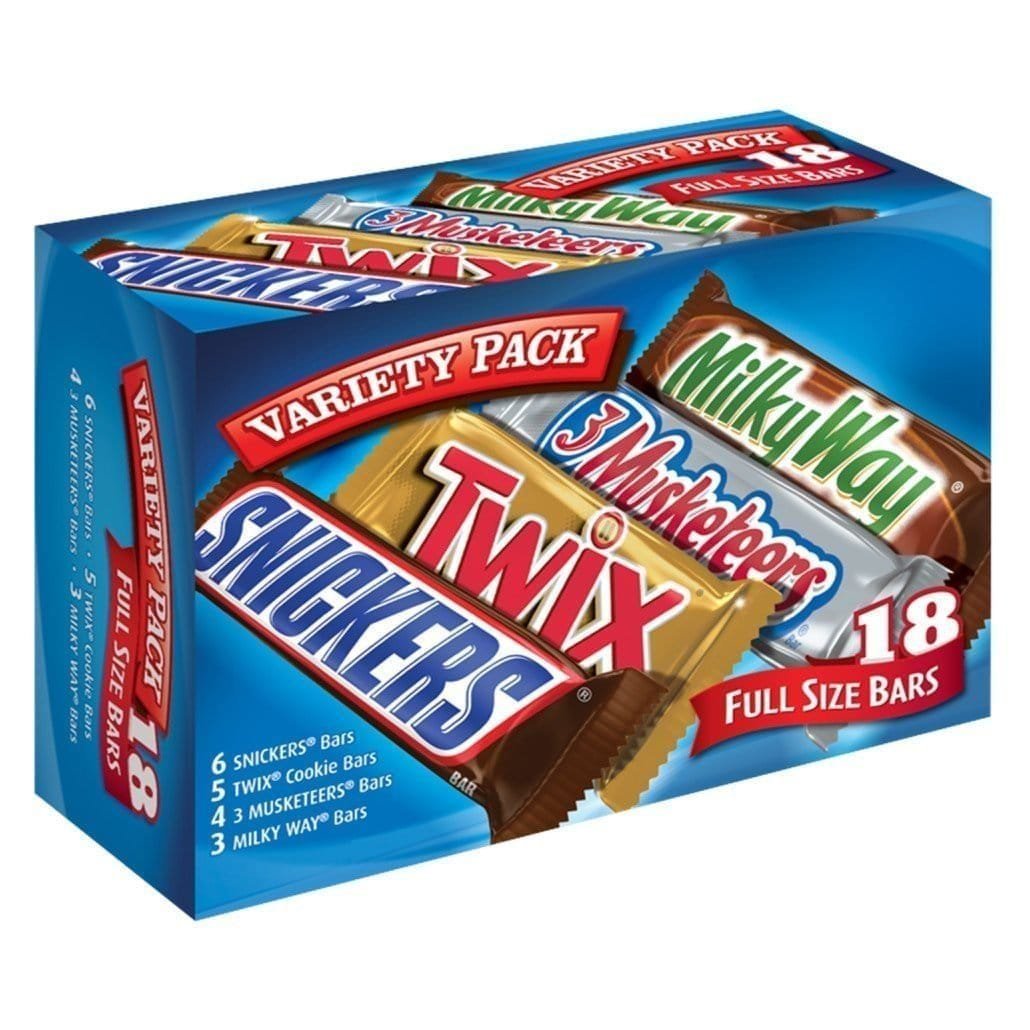 - Contains one 33.31-ounce, 18-count box of full-size, individually wrapped SNICKERS, TWIX, 3 MUSKETEERS and MILKY WAY Chocolate Bars